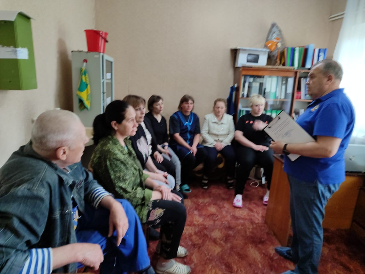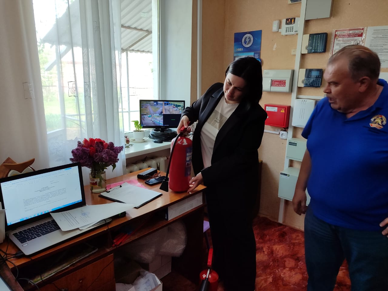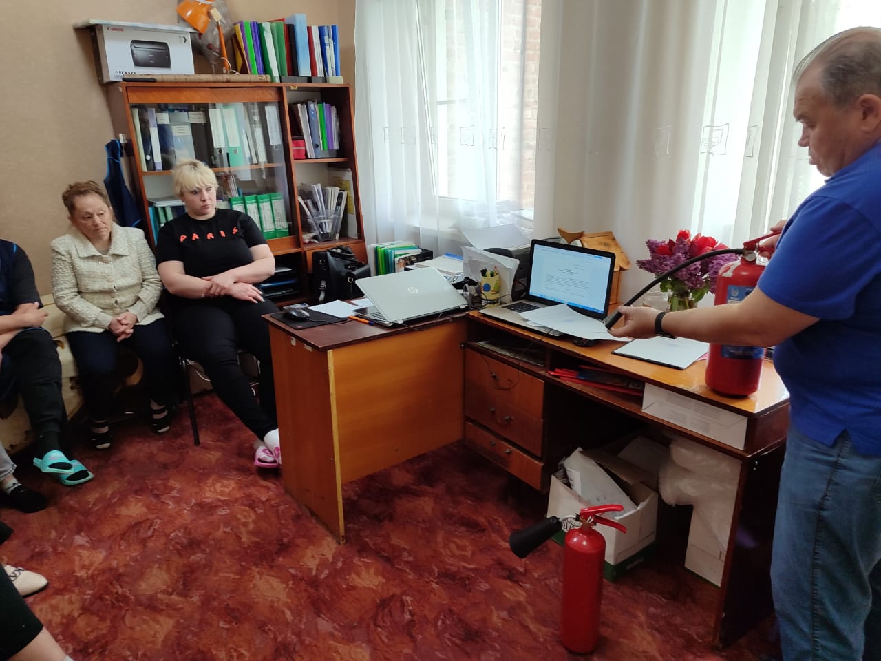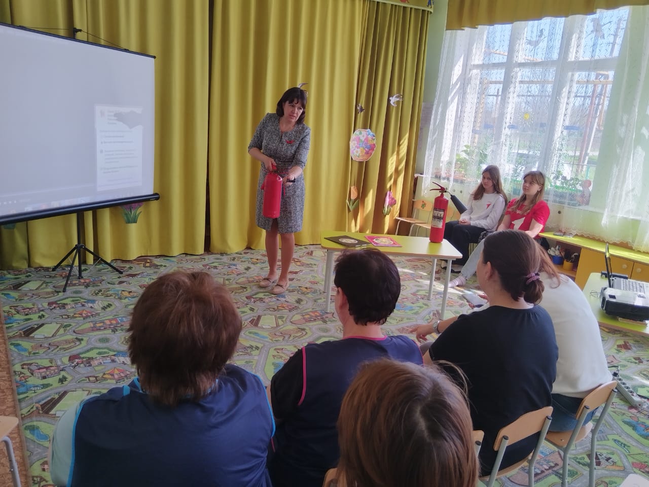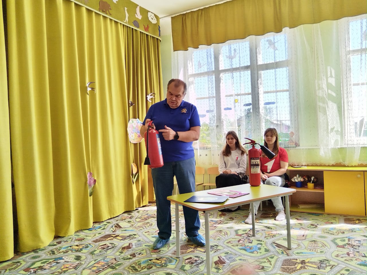 В.Г. Мелешко объяснил персоналу детского сада правила пожарной безопасности, а так же разъяснил порядок проведения эвакуации при пожаре и правила применения первичных средств пожаротушения: умению правильно применять порошковые и углекислотные огнетушители.